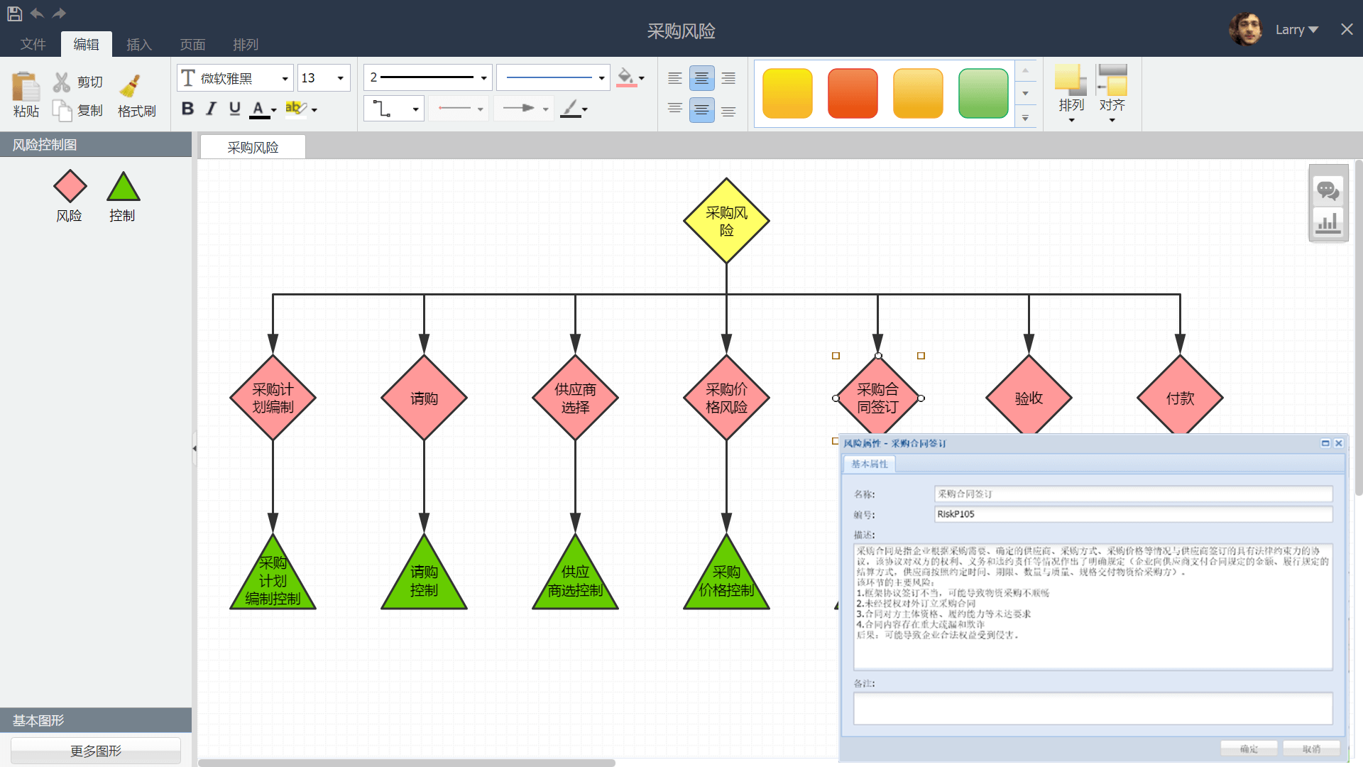 参照组织结构梳理的方法,在【控制】文件夹下的子目录【风控体系】中,新建文件,选择【风险控制图】模板,进行企业风险控制体系梳理。效果如下: