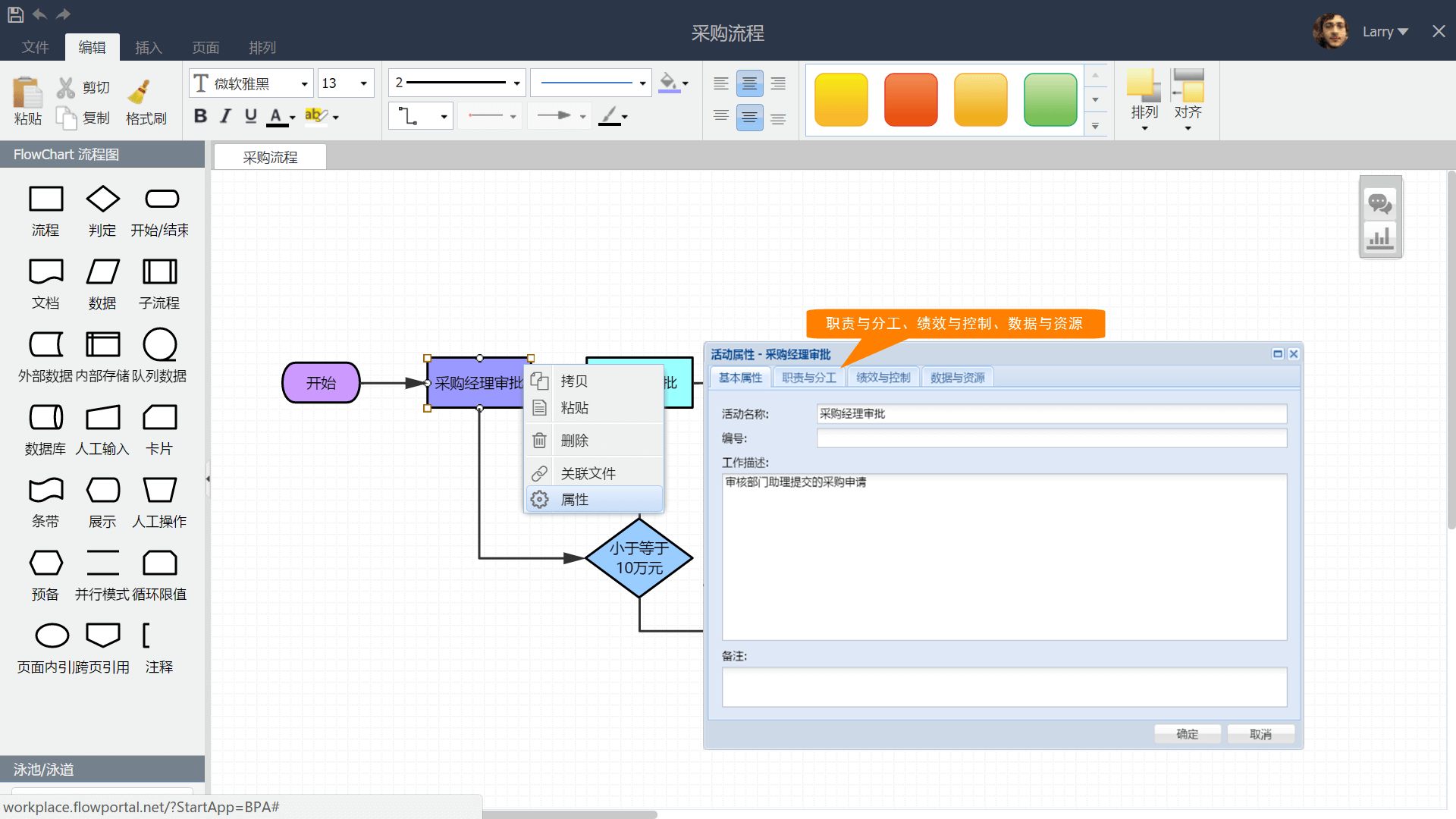 如下图所示,进入流程设计界面,选中流程中的【采购经理审批】节点,点击鼠标右键,选择【属性】,在弹出的活动属性窗口中根据文字提示完成对负责人、风险点、制度、绩效等管理要素的关联。