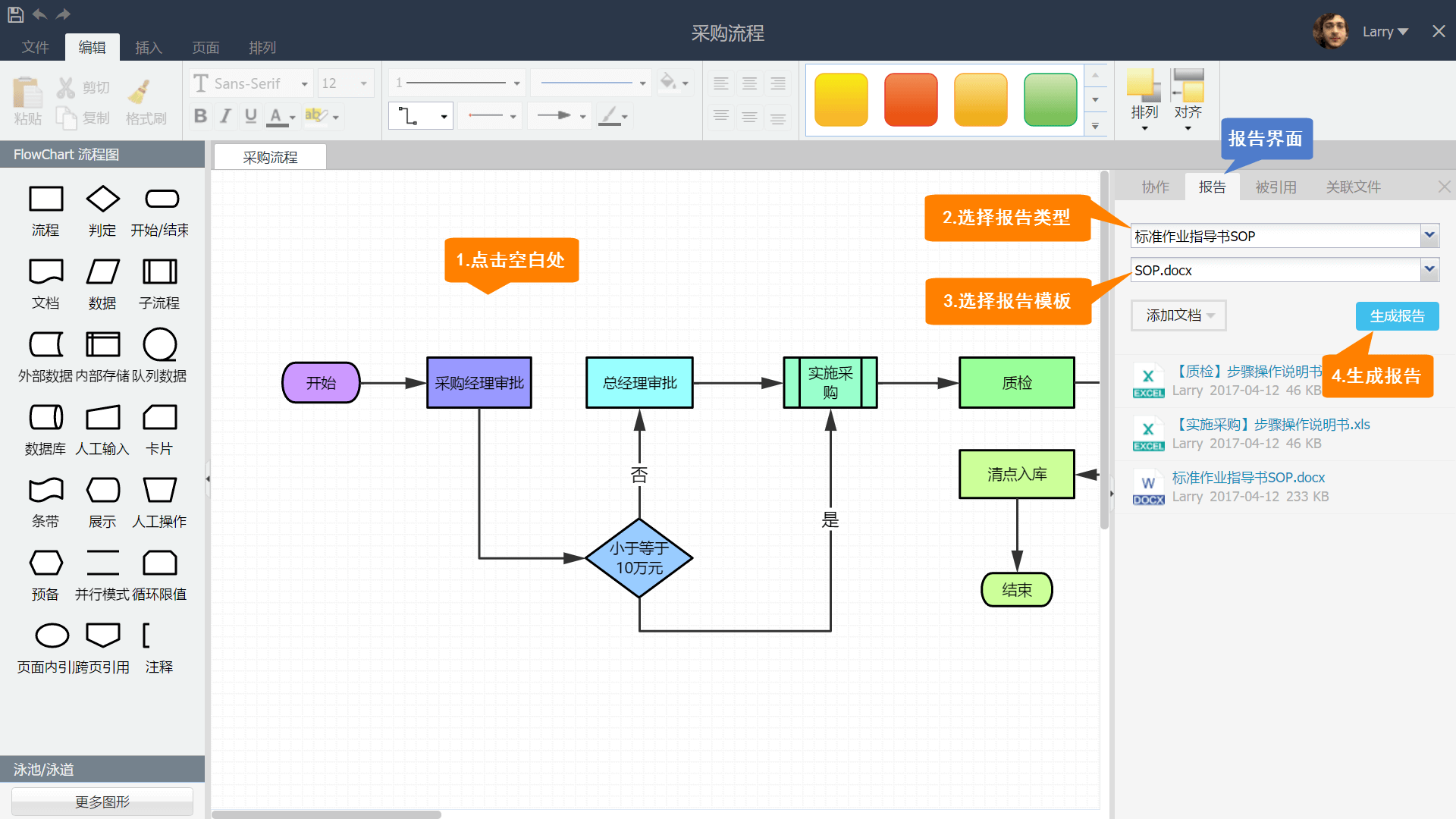 点击流程空白处,然后在右侧报告界面中选择所需的报告类型与报告模板,接着点击生成报告,这样流程作业指导书就生成了。