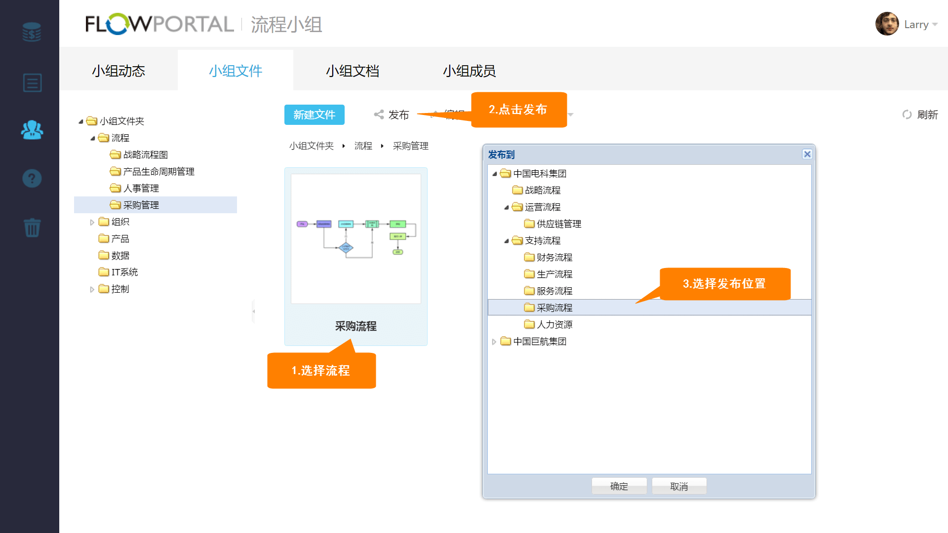 如下图:进入流程小组-小组文件界面,选择要发布的流程【采购流程】,点击【发布】按钮,在弹出的窗口中选择想要发布到企业流程库中的具体位置,点击确定,则流程发布完成。