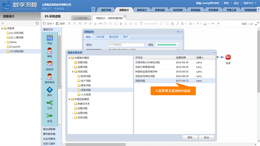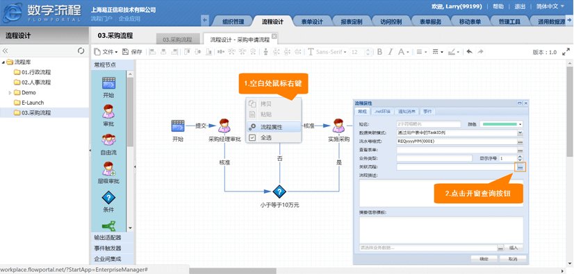 在流程空白处点击鼠标右键,选择流程属性,在弹出窗口中的【关联流程】栏位,点击右侧的【开窗查询】按钮,选择所需的BPA流程【采购流程】进行关联。