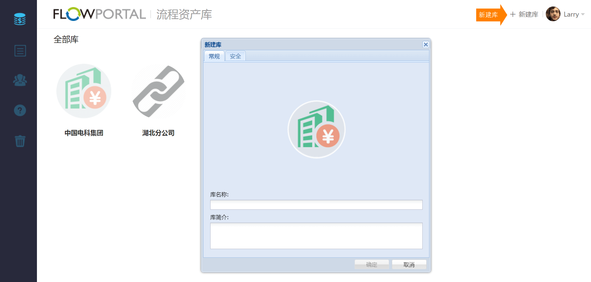进入【流程资产库】界面,点击【新建库】按钮,打开新建库窗口,根据文字提示完成流程库创建。