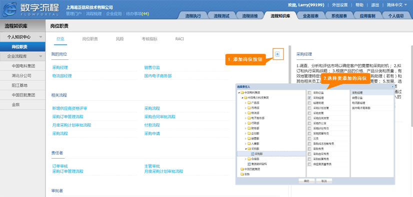在FlowPortal BPM 前台,切换到【流程知识库】模块,在左侧Grid中选择【岗位职责】,即能进入岗位职责界面。