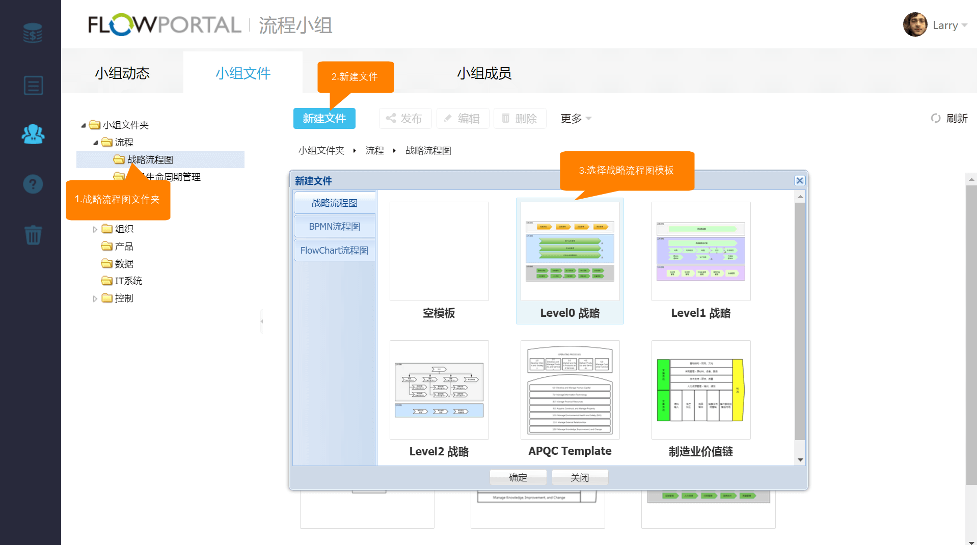 选择左侧导航菜单的【战略流程图】文件夹,点击【新建文件】按钮,选择【战略流程图】模板,进入流程设计界面。
