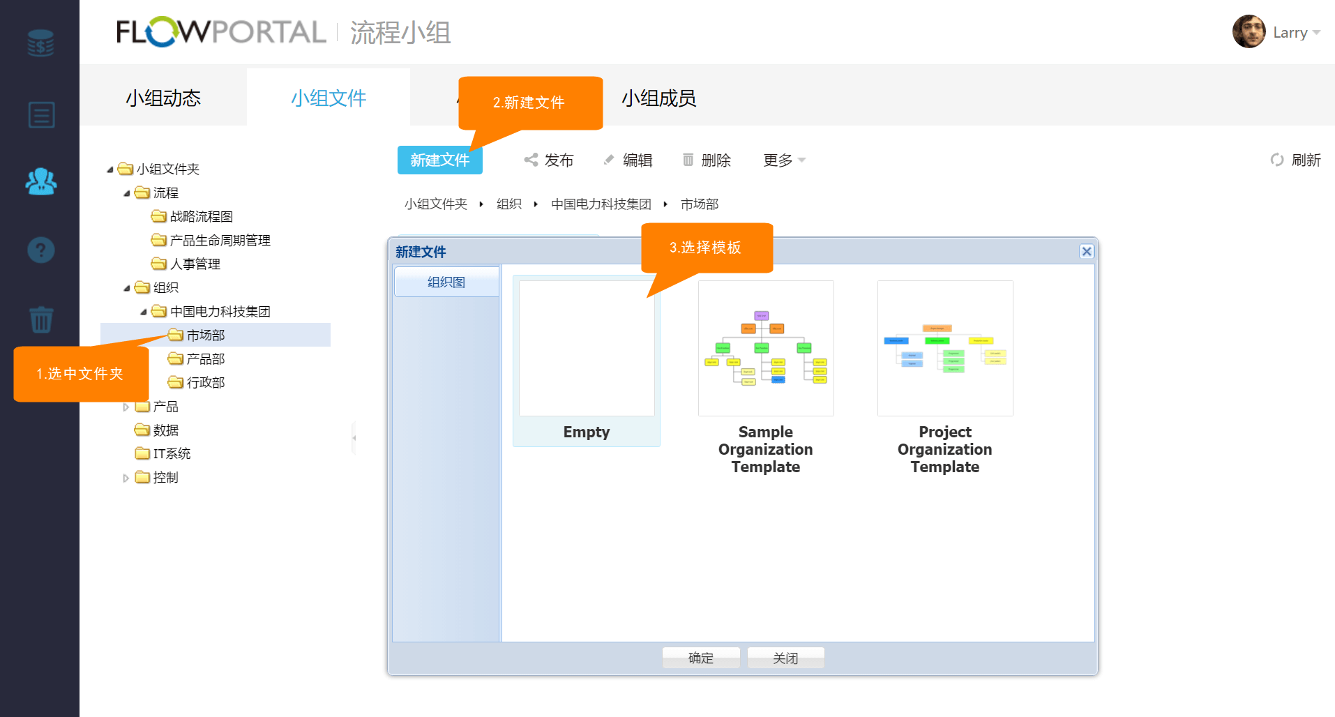 在左侧【组织】文件夹下,选中子部门【市场部】,点击【新建文件】按钮,选择【Empty】模板,进入组织结构梳理界面。