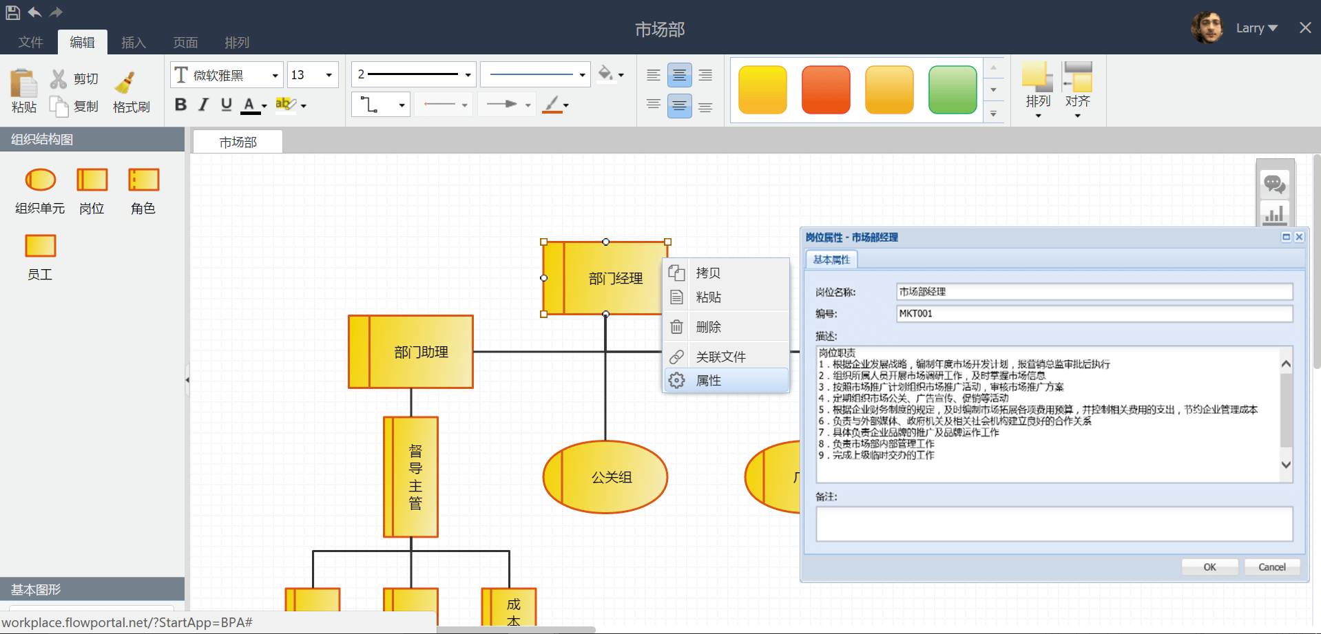 选中部门经理,点击鼠标右键,选择属性,在弹出的【岗位属性-部门经理】窗口,根据文字提示完成对部门经理的岗位属性设置。