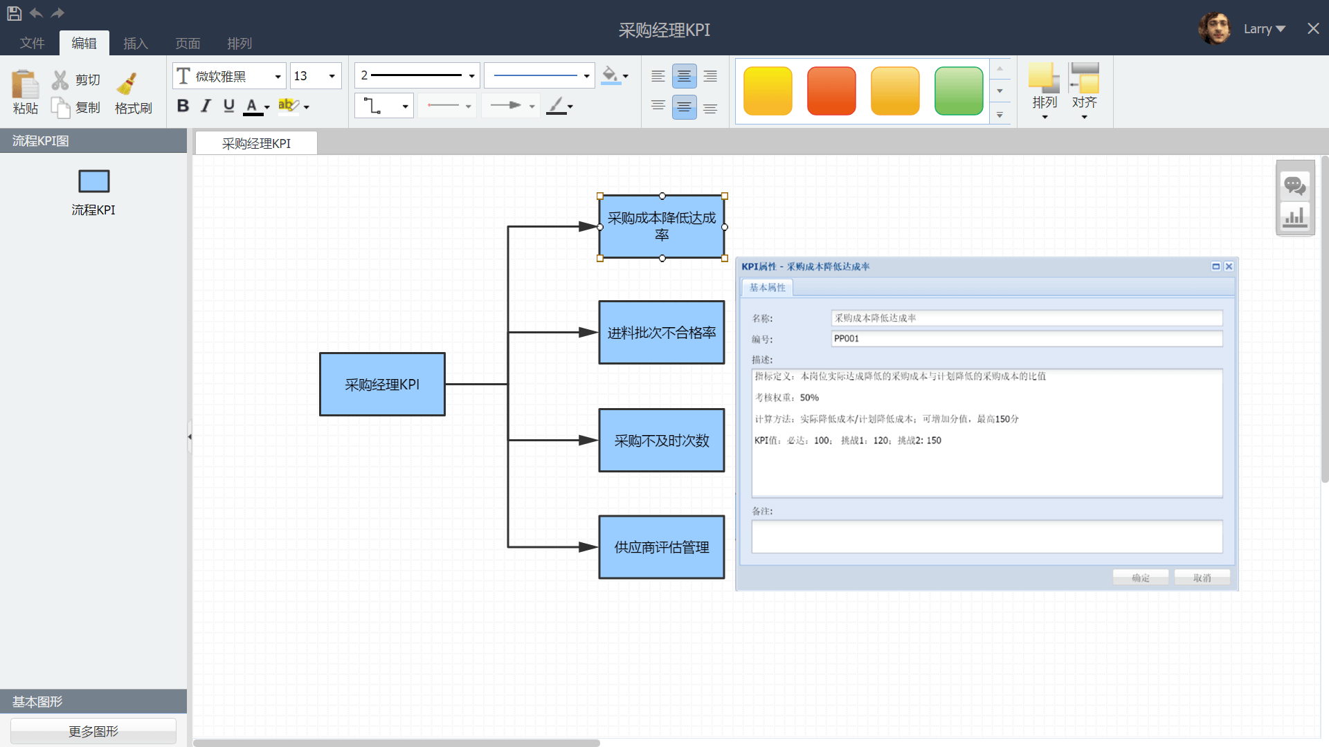 参照组织结构梳理的方法,在【控制】文件夹下的子目录【KPI】中,新建文件,选择【流程KPI图】模板,进行企业KPI体系梳理。效果如下: