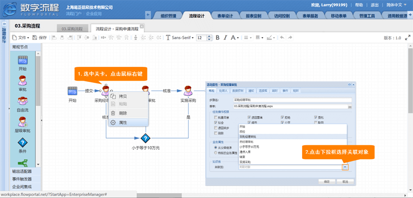 选择关卡【采购经理审批】,点击鼠标右键,选择【属性】,在弹出窗口中的【知识库-关联到】栏位,点击右侧的【下拉框】按钮,选择关联对象【采购经理审批】,点击确定完成此关卡的关联。