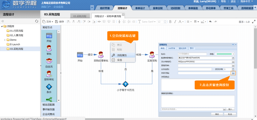登录FlowPortal BPM 管理后台,进入【流程设计】模块,打开具体流程的设计界面,下图中打开了采购申请流程。