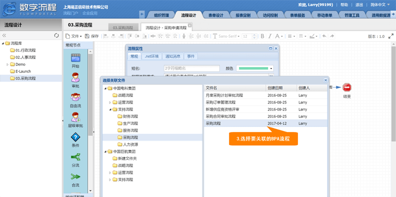 在流程空白处点击鼠标右键,选择流程属性,在弹出窗口中的【关联流程】栏位,点击右侧的【开窗查询】按钮,选择所需的BPA流程【采购流程】进行关联