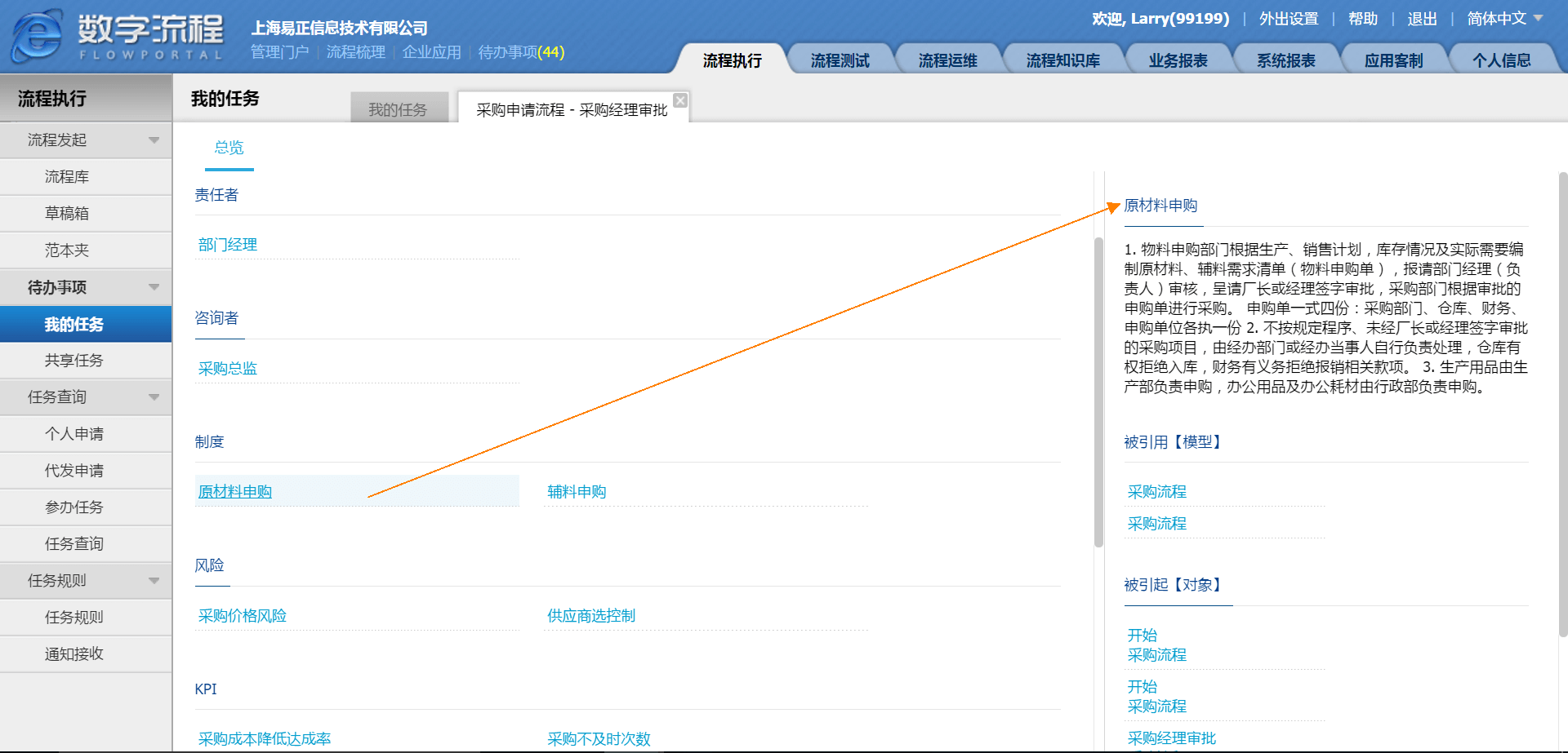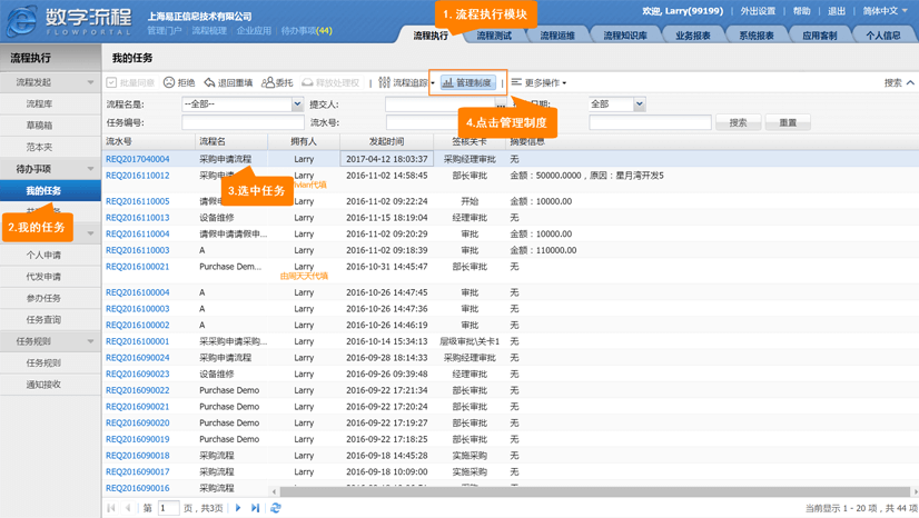 登录FlowPortal BPM 前台,在【流程执行】模块,进入【待办事项-我的任务】界面,选中任务,然后点击右上方的【管理制度】按钮,即能查看该任务的辅助决策信息。