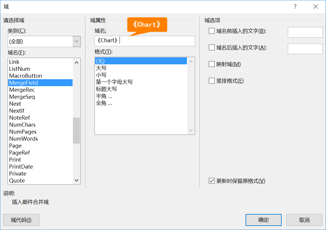 在报告模板中,在上方工具栏中选择插入-文档部件-域,在弹出的域窗口中选择域为MergeField,然后您可以通过填写不同的域名来插入相应的报告内容了。