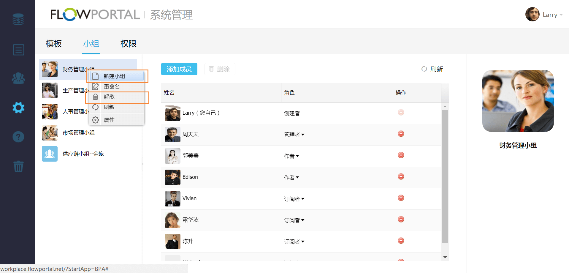 在【系统管理】模块的【小组】界面,您可进行以新建、解散小组及小组成员的管理。