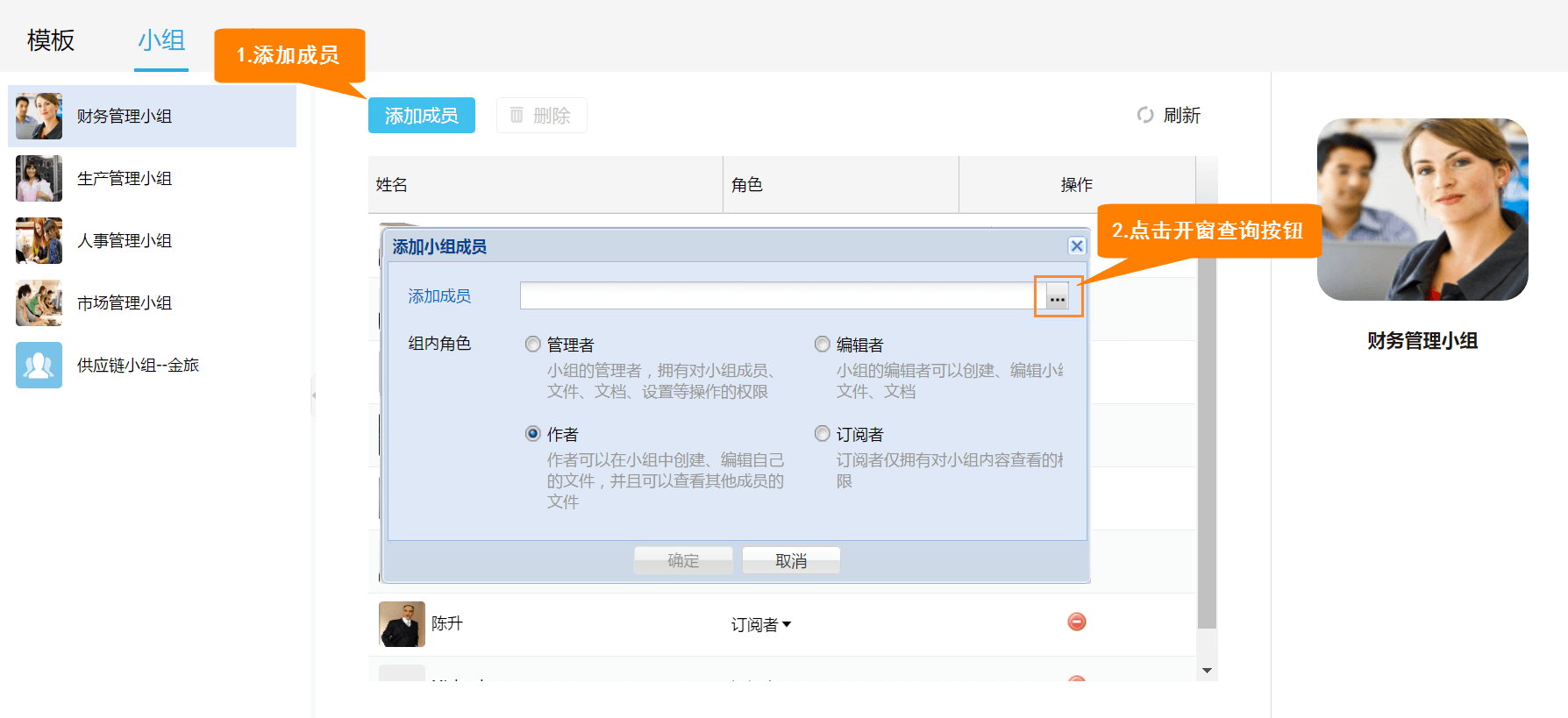 点击【添加成员】按钮,在弹出窗口中的【添加成员】栏位,点击右侧的【开窗查询】按钮,选择要添加的小组成员进行添加,同时您可以设置新加成员的组内角色(管理者、编辑者、作者或订阅者)