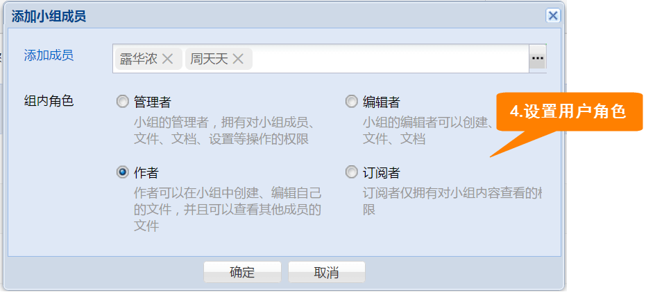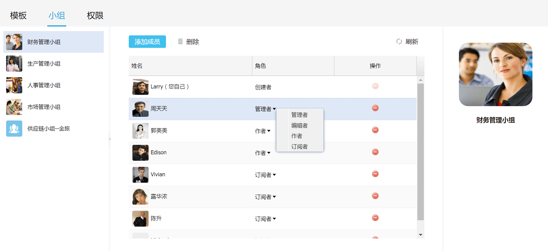 管理者:小组的管理者,拥有对小组成员文件、文档、设置等操作权限